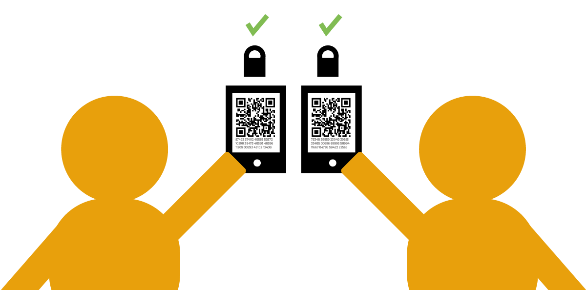 လူနှစ်ယောက်က QR code ‌တွေနဲ့ ကိန်းစဉ်တွေ စာလုံးတွေပါတဲ့ စာတွဲကြီးတွေပေါ်နေတဲ့ ဖုန်းစခရင်နှစ်ခုကို ယှဉ်လျက်ကိုင်ထားပါတယ်။ တစ်ယောက်နဲ့တစ်ယောက် ဖုန်းကင်မရာသုံးပြီး အပြန်အလှန် QR code စကင်ဖတ်လို့ စကားဝှက်သော့ကို အတည်ပြုကြပါတယ်။ သော့ခလောက်တွေနဲ့ အစိမ်းရောင်အမှန်ခြစ်လေးက သူတို့ရဲ့ အတည်ပြုစစ်ဆေးမှု အောင်မြင်တာကို ရည်ညွှန်းပါတယ်။