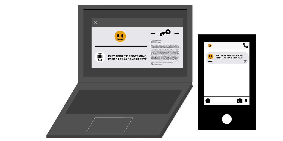 ဘယ်ဘက်က လက်ပ်တော့မှာ PGP အများသုံးသော့၊ ကိန်းဂဏန်း ၄လုံးပါ ကိန်းစဉ် ၁၀ ခုတွဲနဲ့ အပြုံးမျက်နှာတို့ကို တွေ့ရပါမယ်။ ညာဘက်က စမတ်ဖုန်းမှာတော့ အတည်ပြုမယ့်နည်းလမ်း ဖြစ်တဲ့ Signal အက်ပ်ကိုဖွင့်ထားပြီး တူညီတဲ့ အပြုံးမျက်နှာနဲ့ ကိန်းဂဏန်း ၄ လုံးပါ ကိန်းစဉ် ၁၀ ခုတွဲကို တွေ့ရပါမယ်။